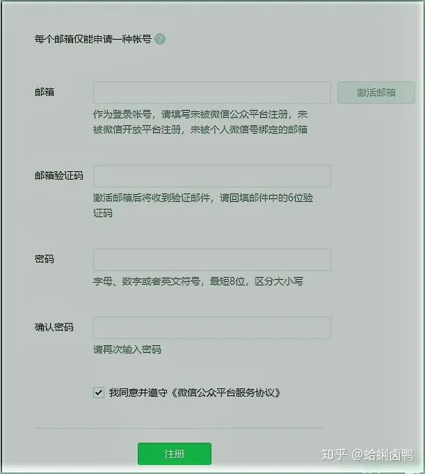 【订阅号】与【服务号】的注册步骤是一样的,填写邮箱,点击【激活邮箱】,再进入邮箱获取验证码,填写验证码后设置好自己的登录密码。