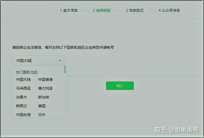 这里默认是【中国大陆】,点击【确定】即可。下面要选择你注册的类型