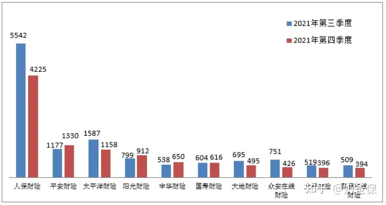 从上图得知,人保财险投诉量位列财产保险公司第1,4225件;排名第2的是平安财险,1330件;排名第3的是太平洋财险,1158件。