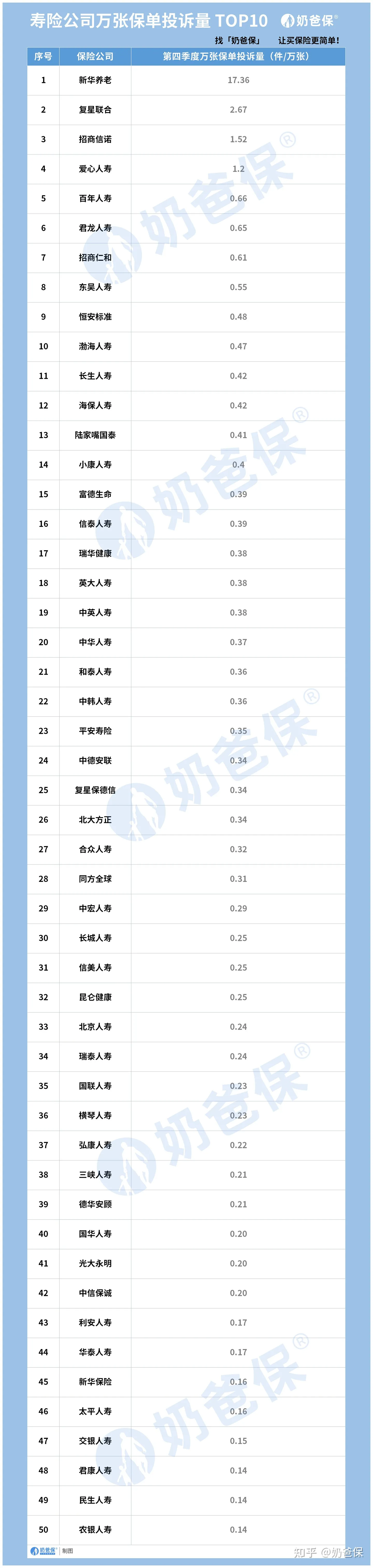 从数据来看:万张保单投诉量中位数为1件/万张,投诉量前10位的保险公司,万张保单投诉量在0.5件/万张以上。