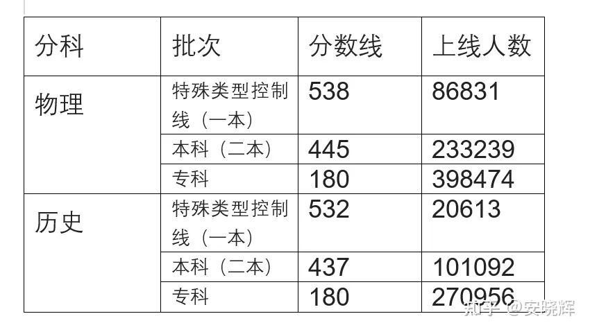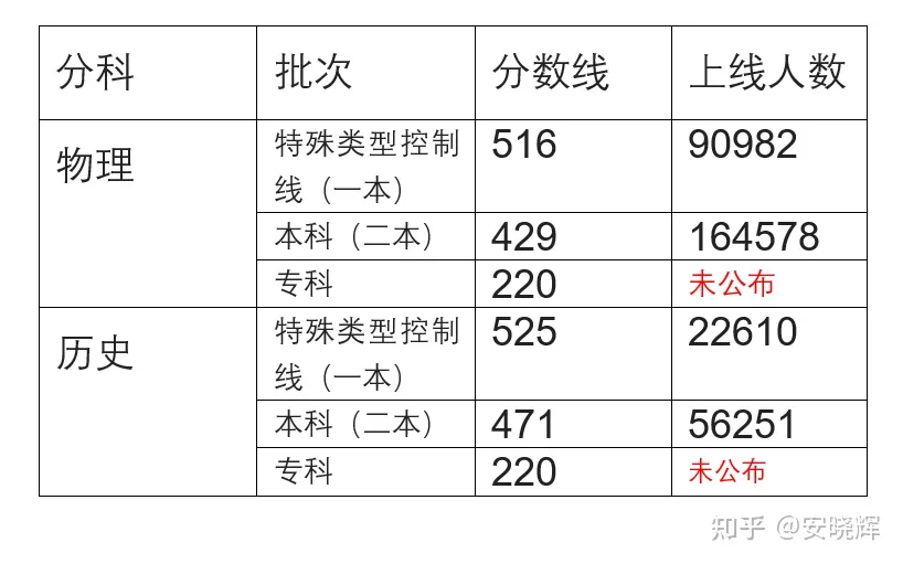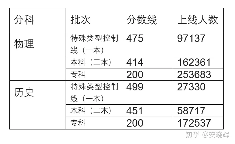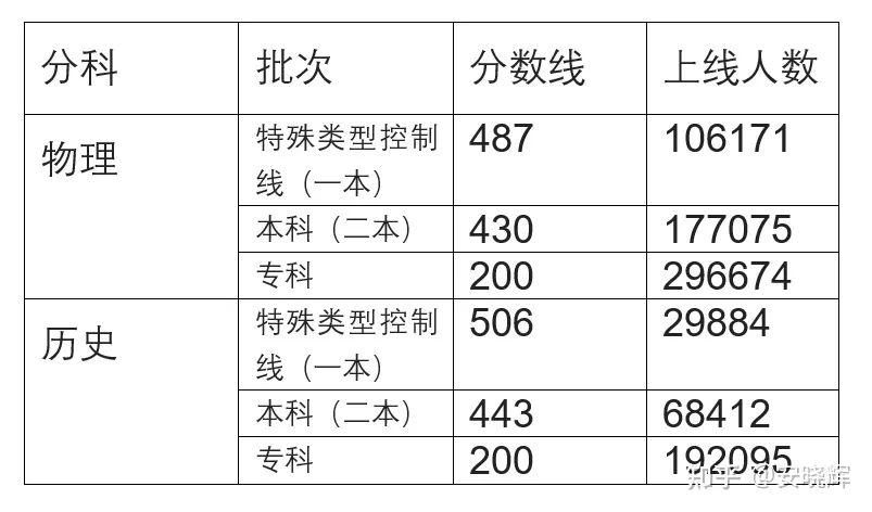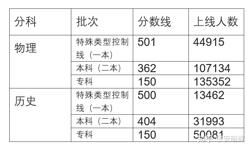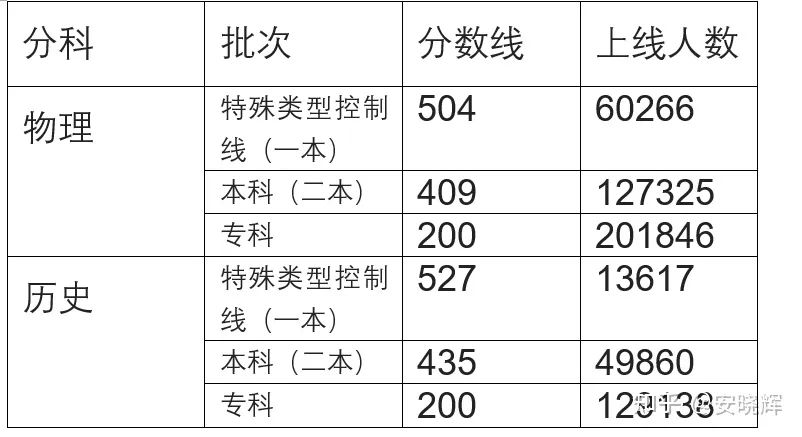 考生分物理类和历史类,高考满分为750分。分数线如下,其中特殊类型控制线就相当于以前的一本分数线。