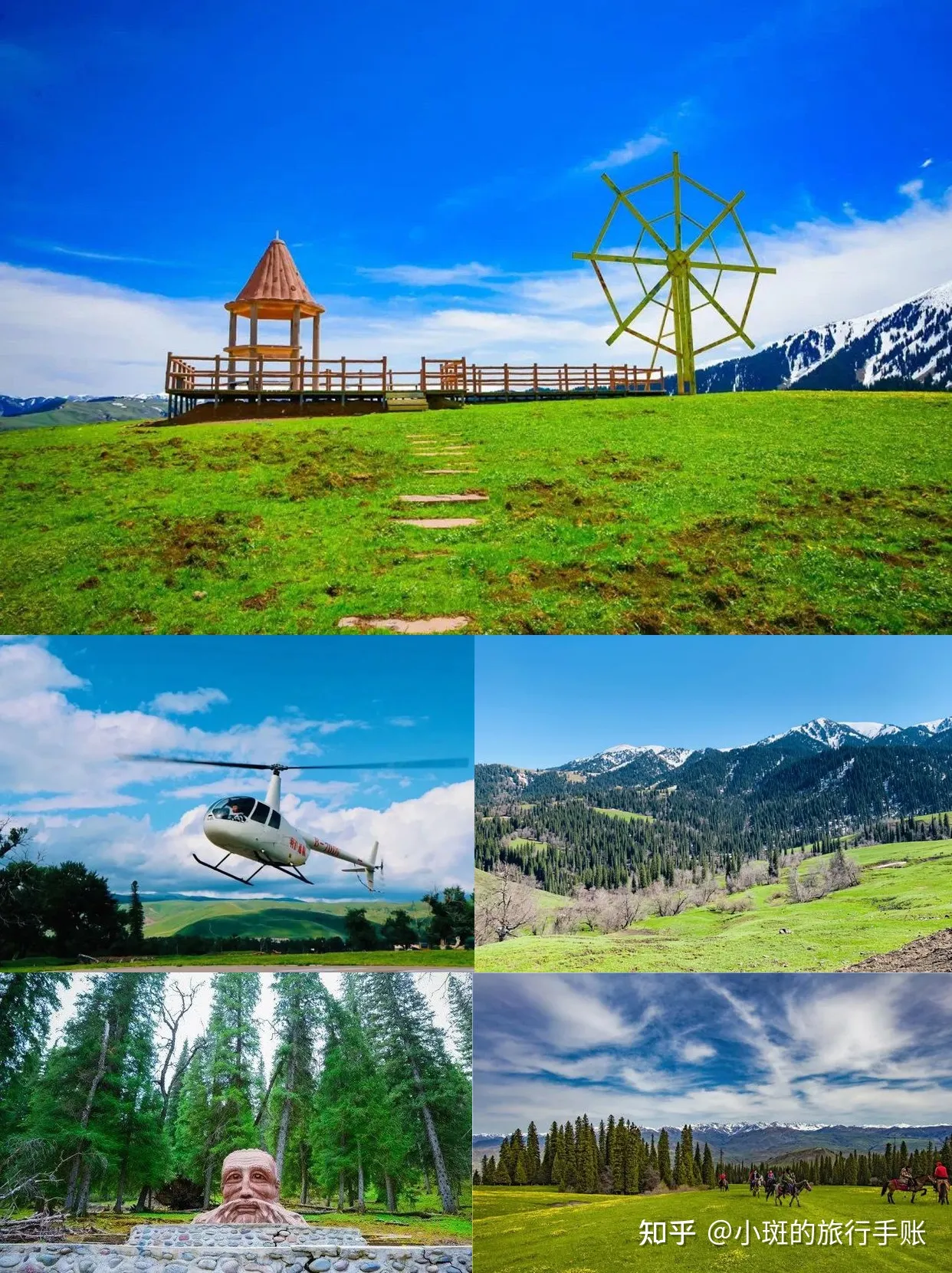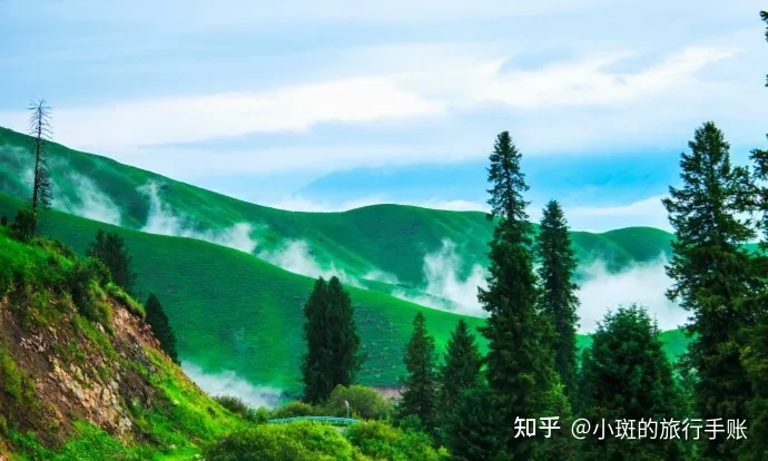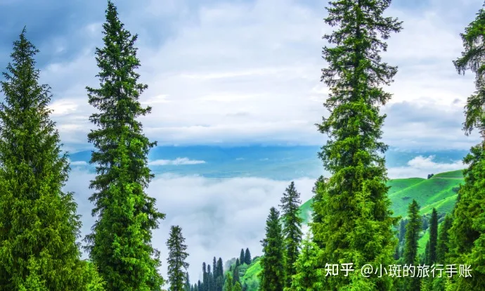 ✔天云台:形象地将天上的云彩像是洁白的羊群点缀在连绵起伏的山峰上,又像是奔腾的骏马驰骋在山谷间。其实在新疆,蓝天、白云、雪山、草原是最常见的自然美景。因这里地理环境,水资源充沛,条件合适早晚就有云雾缠绕,让人仿佛置身于云海之中,天云台因此而得名。