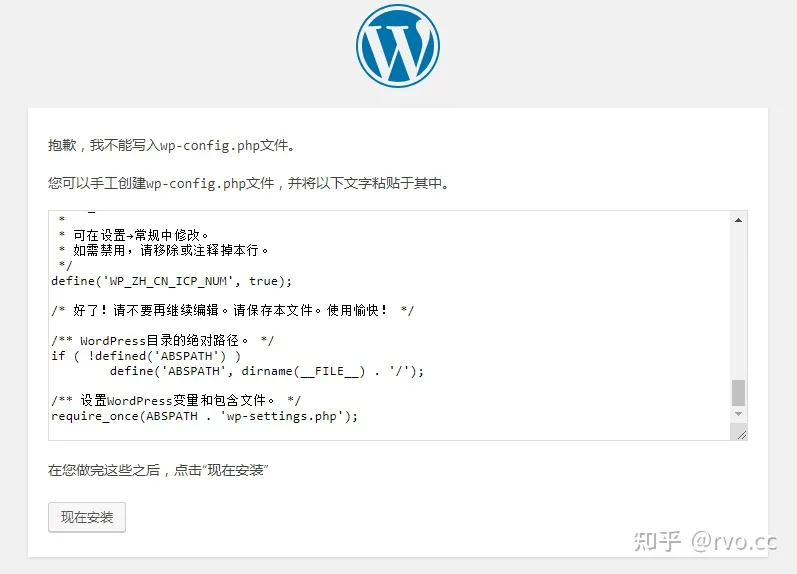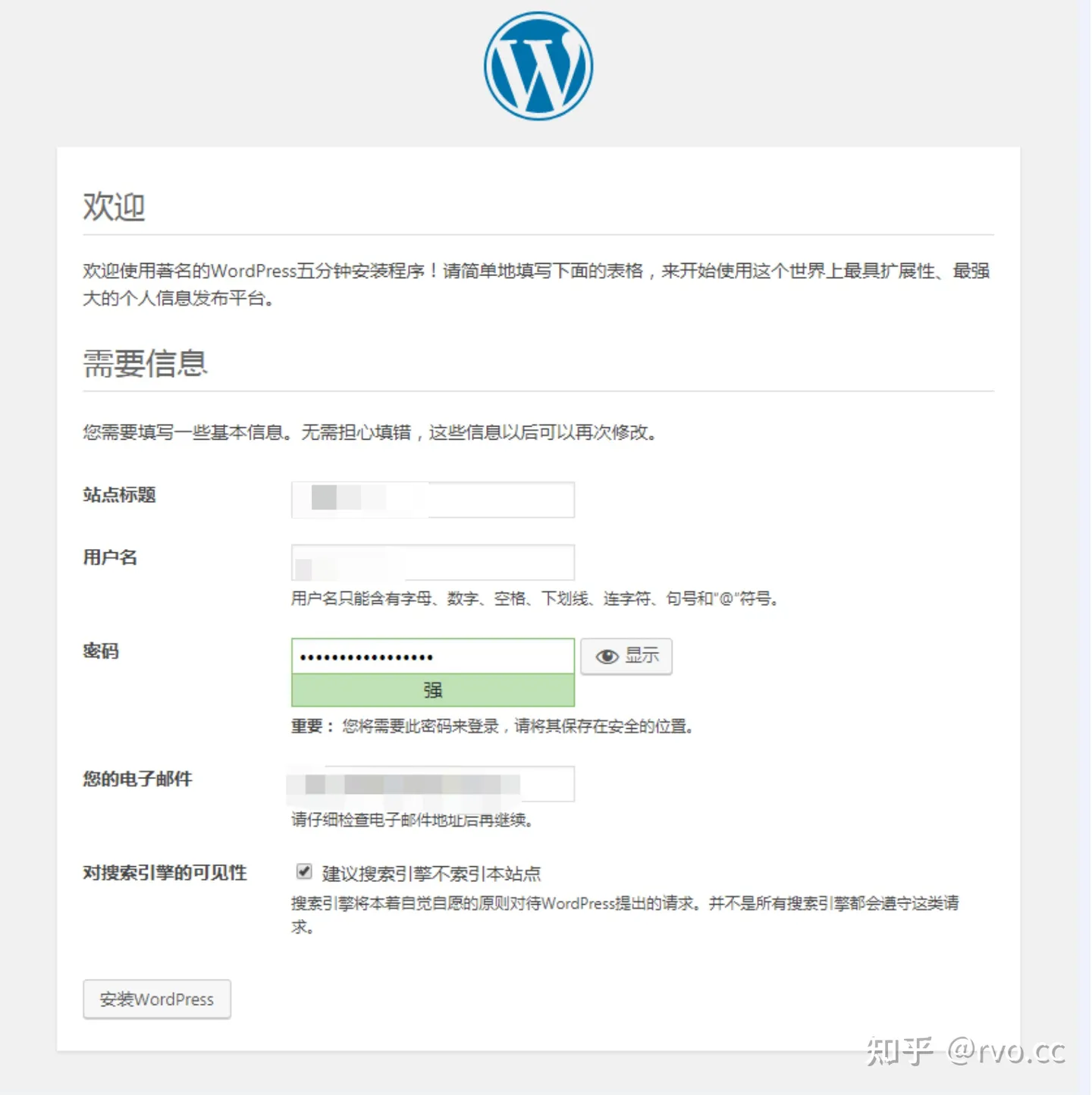 $ vim wp-config.php将上图内容复制进去并wq保存退出,然后点击现在安装。最后就是配置用户信息了,这个是你登录wordpress用户后台的,要记住: