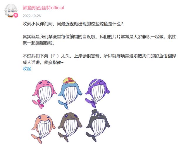 尽管取消了禁漫娘的名号,西丝特还是保留了部分擦边内容,这样才能让大家看得出来她们是官方账号。比如修女与鲸鱼结合的人设,是在刻意模仿半年前红极一时的“修女与鱼”的梗;选用“鲸鱼”这种生物作为原型则是因为它会喷水,这点只能任君想象了……